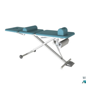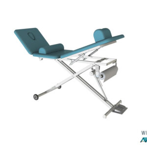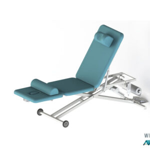 Electrostatic epoxy powder painted special design, metal construction, Electrical actuator system height adjustment, Adjustable backrest and leg rest with pneumatic gas spring. Comfortable uphostered surface phisiotherapy treatment table.